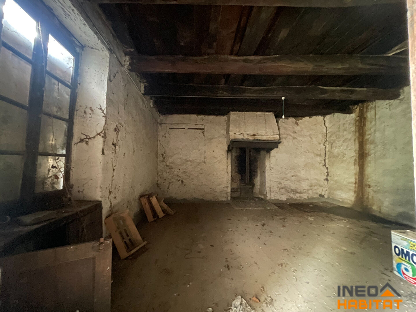 Elle comprend : Une entrée, pièce de vie avec une ancienne cheminée, un grenier au dessus. Une cave en dessous.