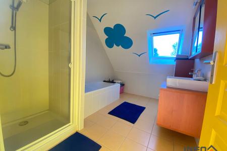 A l'étage on retrouve une mezzanine parfait pour le télétravail, un dégagement donnant sur 2 chambres avec placards, une salle de bain avec douche, lavabo, baignoire. Un WC séparé. Un espace raccordé à l'électricité avec chauffage il ne manque plus que le velux pour faire une 4-ème chambre de plus de 13 m² au sol.