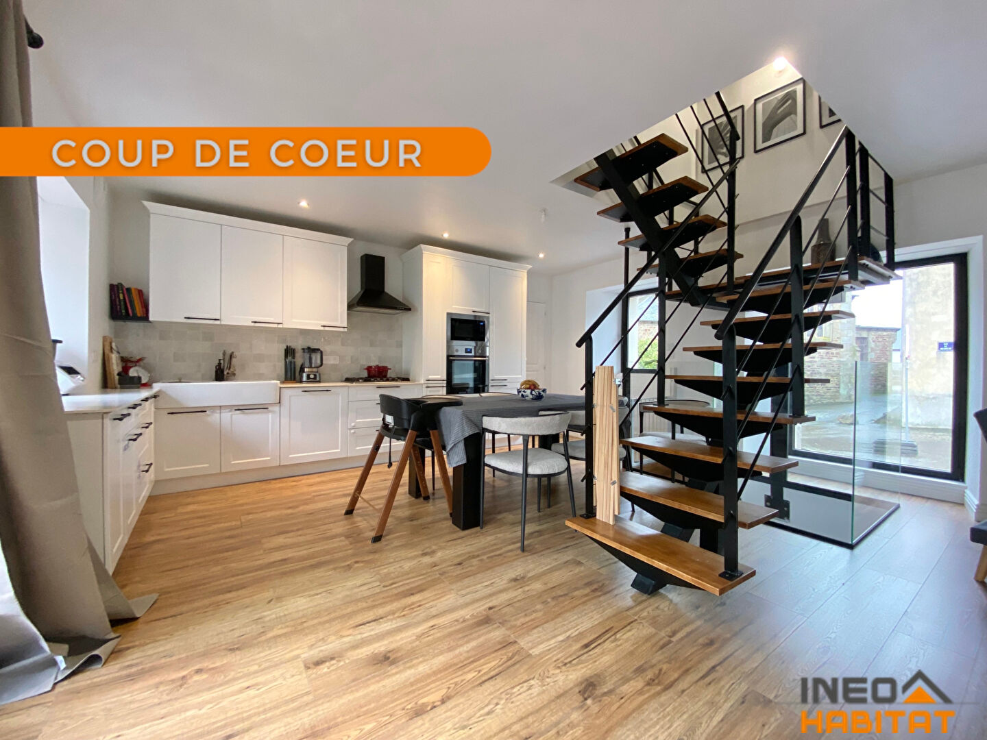 Dès l'entrée, vous serez séduit par une superbe pièce de vie d'environ 45 m², baignée de lumière grâce à son exposition plein sud et sa double orientation traversante. Elle accueille une cuisine aménagée et équipée ainsi qu'un magnifique escalier en acier sur mesure, véritable élément central de la maison. Une buanderie et un WC indépendant complètent ce niveau pour un confort optimal.