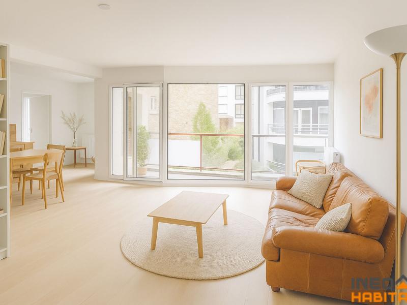 RENNES Gare - Appartement récent de 103 m² à 2 pas du métro. Dans une résidence intimiste de 2000 située dans une rue calme toute proche de la gare, appartement de 103 m² avec séjour Sud. Cet appartement dispose de 3 chambres, 1 salle de bains et 1 salle d'eau, cuisine séparée Aménagée et équipée. Ascenseur, garage fermé, balcon. local vélo. Pas de vis-à-vis. Facile à personnaliser selon vos envies pour un intérieur moderne et accueillant (voir photo IA). (3.50 % honoraires TTC à la charge de l'acquéreur.)