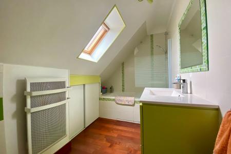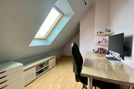 A l'étage, vous trouverez un palier distribuant deux chambres d'enfants (ou bureaux selon vos besoins), une salle de bains ainsi qu'une troisième chambre d'environ 10 m² avec placard.