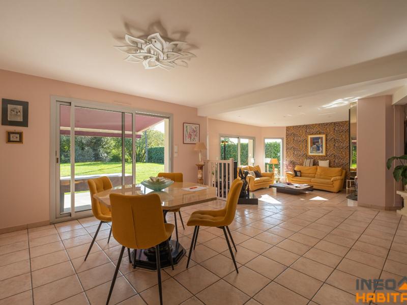 Elle comprend une vaste entrée desservant une grande pièce à vivre exposée SUD avec espace salle à manger et un coin salon et sa cheminée à foyer ouvert. Une cuisine ouverte aménagée et équipée (four, plaque, hotte, lave-vaisselle et cave à vin) et son ilot ainsi qu'une arrière cuisine attenante elle aussi aménagée. Un cellier. Un espace bureau aménageable en chambre ainsi qu'un point d'eau avec placard desservant un WC complète le rez de chaussée.