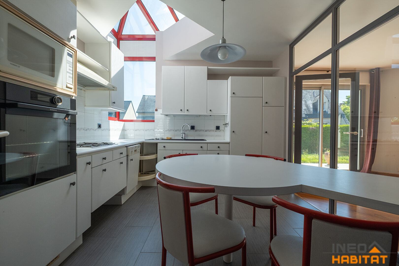 Maison T6 d'architecte située à Saint Grégoire, dans un lotissement calme, dessinée et édifiée en 1990 pour une surface d'environ 142m² agencée en demie niveaux, vous trouverez :