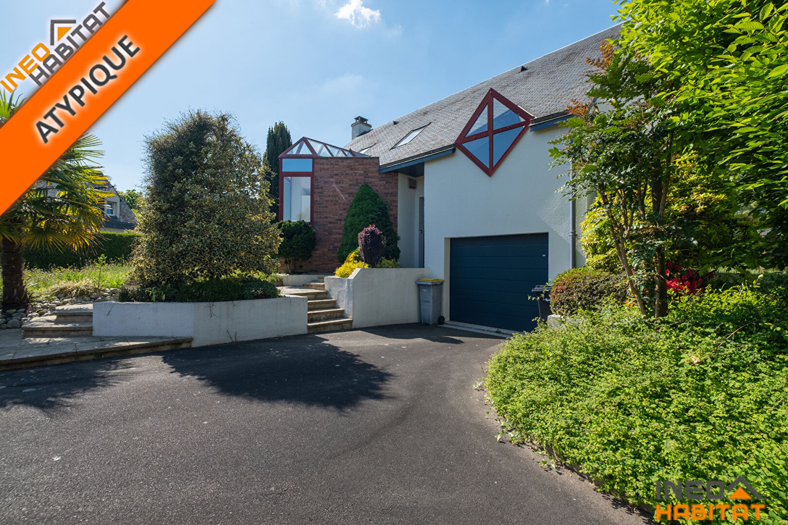 Maison T6 d'architecte située à Saint Grégoire, dans un lotissement calme, dessinée et édifiée en 1990 pour une surface d'environ 142m² agencée en demie niveaux, vous trouverez :