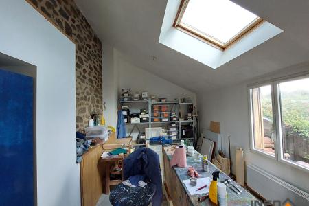 A l'étage : une mezzanine, deux chambres dont une très spacieuse, une salle de bain avec wc, un grenier de 25m².