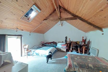 A l'étage : une mezzanine, deux chambres dont une très spacieuse, une salle de bain avec wc, un grenier de 25m².